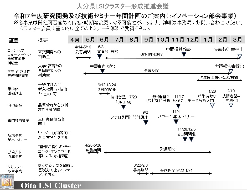 令和7年度研究開発及び技術セミナー年間計画のご案内(:イノベーション部会事業) ※各事業は開催可否含めて内容・時期等変更になる可能性があります。詳細は事務局にお問い合わせください。 クラスター会員は基本的に全てのセミナーを無料で受講できます。